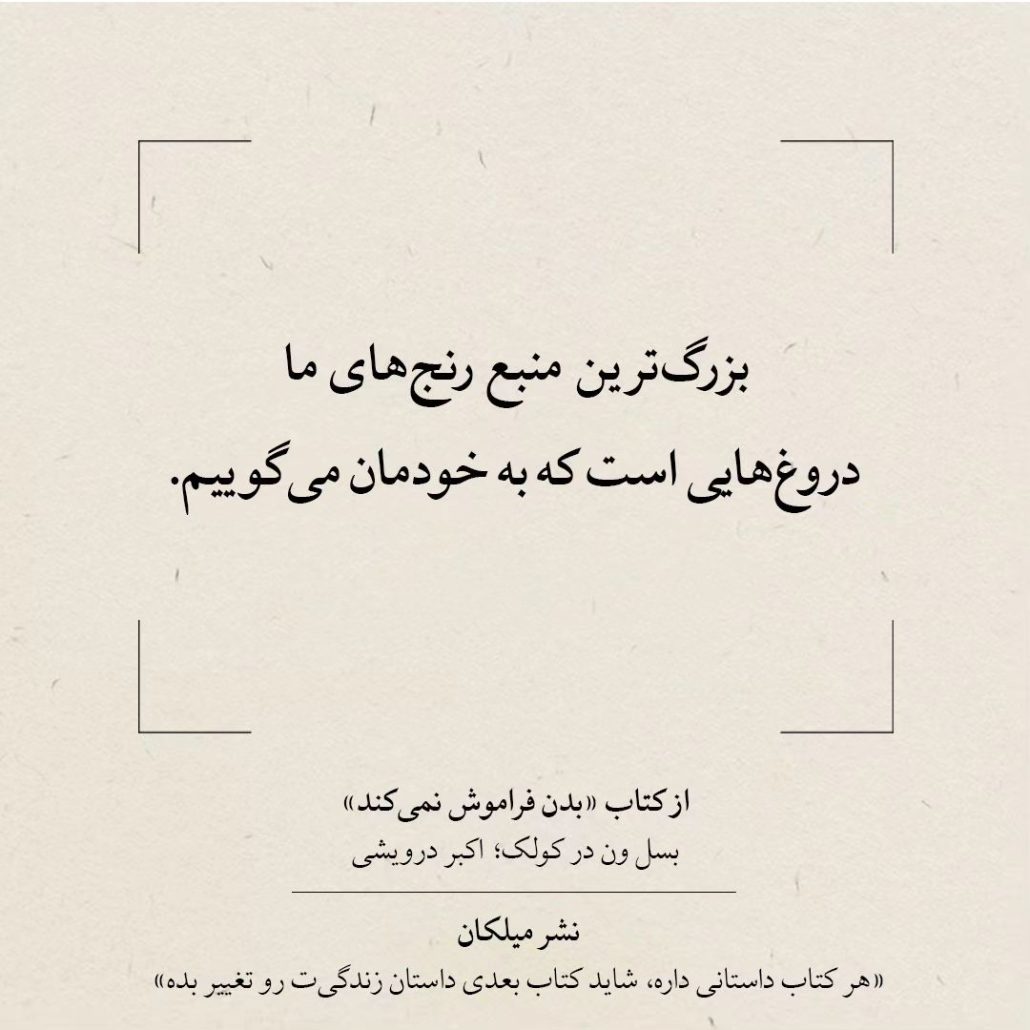 در این کتاب شیوههای درمانی نوآورانهای مانند بازخورد عصبی، مراقبه، ورزش، تئاتر و یوگا ارائه میشود. شیوههایی که با فعالسازی خاصیت انعطافپذیری طبیعی مغز، مسیرهای تازهای را برای بهبودی میگشایند. بدن فراموش نمیکند براساس پژوهشهای شخصی نویسنده و فعالیتهای سایر متخصصین برجستهی این حوزه، قدرت خارقالعادهی ارتباطات انسانی را هم برای آسیبرساندن و هم برای بهبودی نشان میدهد و امیدواری جدیدی برای احیای زندگی افراد به وجود میآورد.