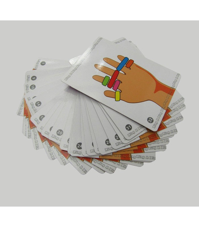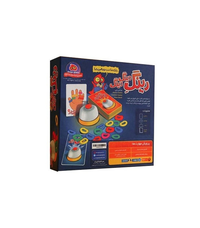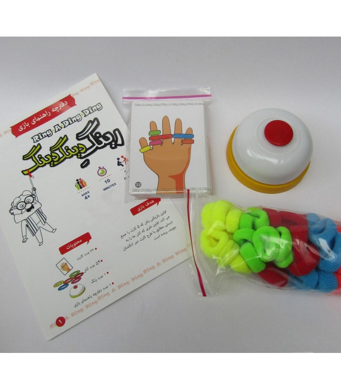 درباره بازی: بازی فکری و هیجانی رینگ دینگ دینگ یک چالش هیجان انگیز برای هماهنگی ، دقت و سرعت عمل است. این بازی مناسب مهمانی ها و جمع های خانوادگی و دوستان است. بازیکنان کارت ها را برمی دارند و به سرعت کش های رنگی را از روی زمین می قاپند تا طرح کارت را با کش های رنگی روی انگشتان دست خود درست کنند. اولین نفری که چیدمان کش ها را به دور انگشتانش تمام کند زنگ بازی را به صدا در آورده و بازی را در آن دور برنده می شود.