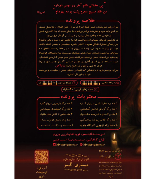 اما وقتی مهمانان میرسند با صحنهای هولناک روبهرو میشوند. بدن بیجان میزبانان، بر سر میز آخرین شامشان. تنها شاهد این قتل آخرین تابلو نقاشی آقای جمشیدی بود؛اثری که نامی پر تکرار در تاریخ دارد: شامآخر. برای پردهبرداری از رازهایی که تنها در دنیای هنر و جنایت رخ میدهد باید پا به این اثر بگذارید.