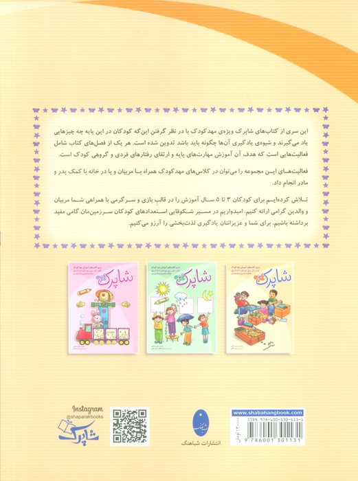 این سری از کتاب های شاپرک ویژه مهد کودک با در نظر گرفتن این که کودکان در این پایه چه چیزهایی یاد می گیرند و شیوه یادگیری