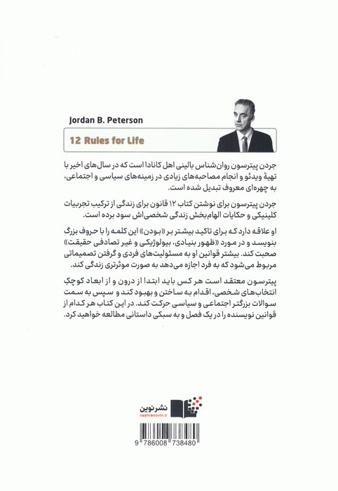 روانشناس مشهور جردن پیترسون، برای پاسخ به سؤالاتی که از مهمترین و مشکلترین سؤالات در زندگی همهی افراد هستند، بهطور اختصاصی حقایق بهدستآمده از تاریخ را با نتایج جذاب تحقیقات پیشرفتهی علمی ادغام میکند. دکتر پیترسون در کتاب 12 قانون زندگی، با استفاده از لحنی طنزآمیز و درعینحال خیرهکننده و تأثیرگذار به ما میآموزد که چرا نباید بیشازحد نگران فرزندانمان باشیم و گاهی لازم است که آنها را به امان خدا رها کنیم، چرا نباید بیشازحد سختگیر و مقرراتی باشیم و اینکه چرا باید بیدریغ به جهان اطرافمان محبت کنیم.