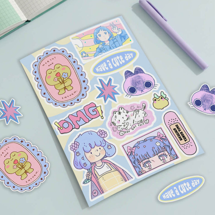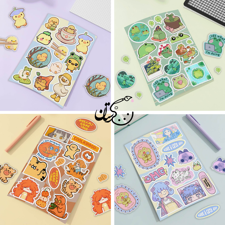 ♡ 4 برگ استیکر پر از طرحای خوشگل و کیوت : سایز هر برگ A6 هستش (حدود ۱۰×۱۵ سانتیمتر) که واسه خودش یه دنیای کوچیک و بامزست ♡